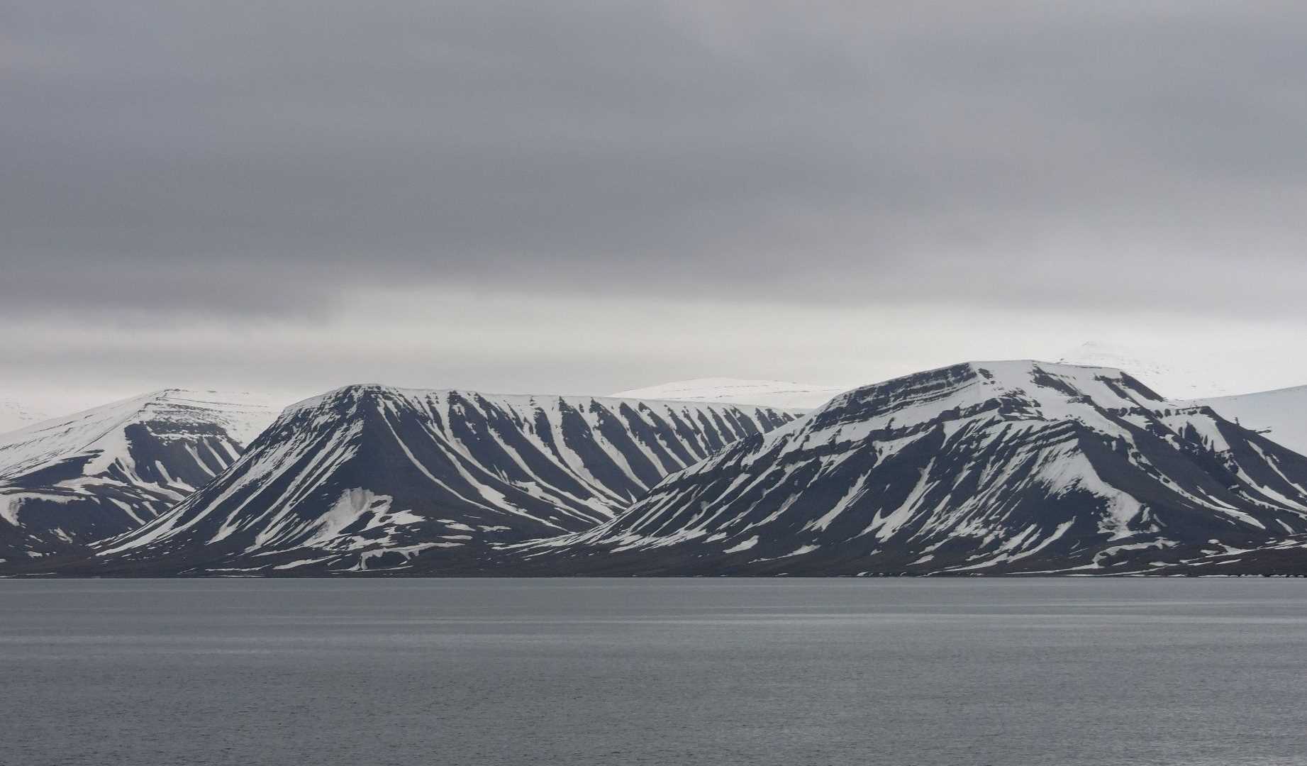 Early this morning, long before breakfast, the National Geographic Explorer sailed into the large, wide bay known as Bellsundet in southwest Spitsbergen. Deep inside, we squeezed through the narrows formed by the island of Akseløya and the mainland to enter Van Mijenfjorden. We sailed close to the now-abandoned coal mining site of Sveagruva, where we saw the community’s old buildings, towers, and storage tanks. The mine was established by Swedes in the early 20th century to extract high-quality anthracite and was later taken over by Norwegians who operated before closing in 2016. We discovered fast ice at the head of the fjord and spent time cruising along the ice edge in search of wildlife. The ice was fairly “rotten,” as we say, meaning it had melted considerably, with lots of open water pockets scattered throughout.  This condition makes it easy for seals to haul out onto the ice and rest. In fact, we saw dozens of ringed seals spread out all over the ice. The surrounding mountains in this region are magnificent. Much of the landform was covered with snow, but in some places steep, eroded ravines and layers of ancient sandstones were visible, producing a photogenic herringbone pattern in the geology. On the surrounding, exposed, low hillsides, we could also see many reindeer.