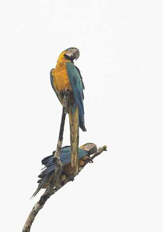 Shortly after sunrise we boarded the skiffs and crossed the Pacaya River towards its northern shore into an area known as Yanallalpa. There we saw an abundance of dead aguaje palm trees, with their leafless bare trunks protruding form the shorter vegetation around them. It wasn’t long before we heard the first loud calls of large parrots and soon discovered not one but six incredibly beautiful blue and yellow macaws perched on a snag! We admired and photographed them as they leisurely combed their long feathers, using their strong beaks, and played with each other. Macaws are very familiar to everyone who has ever visited a zoo or pet shop, but don’t get confused: macaws are among the wildest of the wild and their numbers have diminished throughout their range due to habitat loss and their capture for the pet trade. Their presence is an indicator of the health of the ecosystem. What a privilege to being able to spend some time with such a symbol of wild beauty!