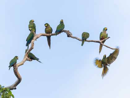 As we scanned the area, we observed three-toed sloths as well as red-bellied macaws, but our goal was to find the colorful Blue and Yellow Macaws that are always associated with pristine ecosystems, like the one we are visiting today. Our efforts paid off, and a couple of them were spotted perched on a nearby tree. As we moved closer, a few more arrived and created a great visual display!