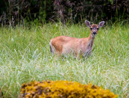 As our skiff slipped into the forest, we observed a tree with a hole overhead from which three cute faces were peeking down. These were a group of night monkeys, the only genuinely nocturnal monkeys. They have a cute owl-like rounded head with immense dark eyes surrounded by white fur, all a good indicator of the creature’s nocturnal way of life. The three monkeys spend their daytime hours cuddled together in this hollow tree hole. At night they forage anywhere from the forest floor to the canopy eating fruits, buds, insects, and flower nectar. These three were very inquisitive and brave, peering down and watching us while we watched back. What a special opportunity to see these nocturnal mammals.