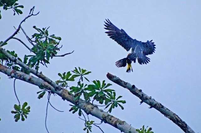 The more we immerse ourselves in deeper areas of the Pacaya-Samiria Reserve, the more amazing wildlife encounters we can experience. Today we started early in the morning with an exploration of the Ucayali River, in a specific area that is known because of its good opportunities to spot different species of macaws. We saw not only blue and yellow macaws, but we were also surprised by a peregrine falcon hunting a yellow-rumped cacique while in flight, an awesome way of starting our day. Before coming back for breakfast, we saw for the first time of the week the monk saki monkey, a very hairy species of monkey with a long and furry tail.