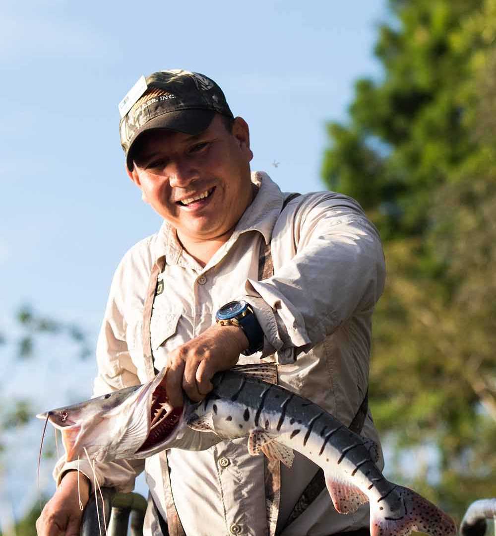 The afternoon was devoted to exploring Dorado River and its surrounding forest. Our exploration at Dorado River consists of a visit that allows us to explore the place at sunset with golden light and at night in order to spot some nocturnal animals such as bats night hawks and the notorious Amazon caiman! We use flashlights to look for them among floating vegetation. It does not take long to find their red glowing eyes among grasses and water lettuce patches.