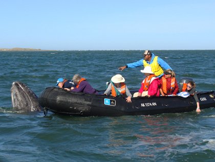 Today we awoke on the National Geographic Sea Bird while floating in the protected and calm waters of Boca de la Soledad, the northernmost entrance to the beautiful coastal lagoon called Magdalena Bay, which is part of an extensive and complex wetland system present in the western side of the peninsula of Baja California. As we all knew, the gray whales come here every winter to give birth and nurse their calves, so we were eager to explore the lagoon and observe these magnificent, gentle, giant marine mammals. Throughout the day we went out in our inflatable crafts, and accompanied our excited guests to help them interpret the complex and fascinating set of behaviors offered by the whales, including spy hopping, breeching, nursing and rolling. Up to 35 pairs of cows and calves were seen in this section of the lagoon. Whales, as we noticed, can be identified individually by the white, black and gray gradations that form unique patterns on their skin, both in calves and their mothers. No whale is identical to another. This has allowed us to give them names, like Sofia, Maria, and so on, for the enjoyment of everyone.