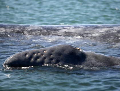 The National Geographic Sea Bird remained anchored at Boca de Soledad through the night and we awakened at dawn to mid-60’s air temperatures and a light breeze of 8-10 mph. The sun rose to a clear day on the bay and people emerged from their cabins to the “pffffft” sound of gray whales all around the ship. The morning exercise class was a bit distracted by their presence, and by a spy-hopper who popped its whole mouth and eyes out of the water to take a peek around. The anticipation of getting a closer look today at these magnificent creatures was palpable.