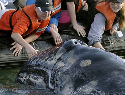 The vacation days you may plan don’t always turn out the way you expect. We adventured off in our expedition landing craft in a beautiful lagoon that seemed full of gray whales. The conditions were ideal with no fog and a gentle breeze under a clear blue sky with a few wisps of clouds. Smiles and the spray from the noses of whales were soon smeared across our faces, hair, hands, cameras, and clothing. We loved it! The grays were everywhere, and many of them seemed quite happy to see us as well. Both morning and afternoon outings had tolerant whale moms that encouraged their young to interact with us by putting their 40-ton bodies against their calves and pushing them to our eager hands. Many of these whales love to be stroked by human hands. Maybe it’s the fuss we make stomping around trying to get to the side the whales are on, stretching as far as we can to touch that damp skin without falling out of the boat, holding children with our outstretched arms for their chance to make contact, splashing and throwing water with our hands like some kind of ritual to appease the whale gods, and generally being totally uninhibited in an almost desperate attempt to make that connection. How grand it is!
