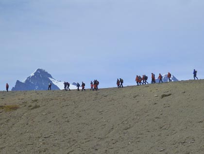 Loaded with cameras and blue-striped towels, whale-watchers descended into Zodiacs to explore the waters. Due to the fog, the first round went by sound, listening for blows through the mist. It took a bit of patience, but finally we found them. At one point there were 5 cow/calf pairs all around the boats, breathing and rolling and sometimes coming in for a curious poke at the big black human toys, with extended tentacles splashing the water and perchance landing on blubber. Incredible! In round two, there were several playful pairs, and one in particular whose mom logged at the surface while baby went around to various boats saying hello. Both mom and baby seemed to enjoy lifting up the end of a boat every so often with their rostrums. The baby seemed to roam quite far from mom on several occasions for long periods of time, something I had not seen before. Mom’s head was beautifully decorated with geometric patterns made up of the barnacles and sea lice.
