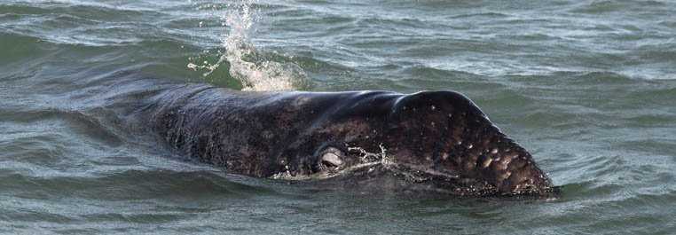 Every round of outings had different experiences. The morning was cool and windy, but by late morning the wind started to die, and the ebbing tide caused many of the cow/calf pairs to seek out the Boca, an opening to the Pacific between two long barrier islands. This channel has sides that rise abruptly in some places where swift currents pass. At some times gray whales choose to swim in this dynamic water. This probably is helpful for the calves that will soon use these skills for swimming in the open ocean. The afternoon warmed even more as the flood tide started. Usually this pushes the whales farther into the lagoon, but today most stayed in the quiet water near the Boca and slowly milled about. Calves found our boats interesting, but their curiosity was quickly satisfied. Climbing over their mom’s tailstock or trying to stay balanced upon her broad body as she surfaced were two of the more popular activities. Today’s photograph shows a young calf with its eye out of the water taking a look at us. You can see a few of the white sensory hairs protruding from small dimples in the skin.