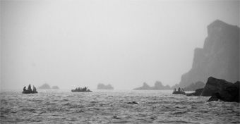 Misty fog added to the mood and mystique as Zodiacs departed National Geographic Orion to circumnavigate Bogoslova Island this morning. Many species of seabirds nest in the safe haven offered here. It was a busy place, with puffins, kittiwakes, murres, cormorants, and gulls coming and going to find food and bring it home. Soon the birds will abandon the island until next nesting season.