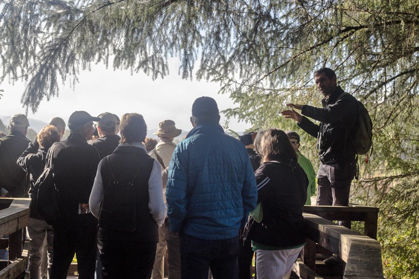 Fall was revealed—brown leaves on the maple trees and brisk air—as we embarked on the day’s first excursion. In the early a.m., after moving east through basalt wonders of the Columbia Gorge, National Geographic Sea Bird entered Bonneville Lock. Staff was on deck, describing the imminent 60-foot rise in the lock. Once launched upstream we passed dozens of wooden fishing platforms reserved for local Native Americans by an 1855 treaty. Bonneville Dam, a towering monument in the midst of the Cascade Mountains, was the first U.S. Army Corps of Engineers cement passage on the Columbia River (1938).