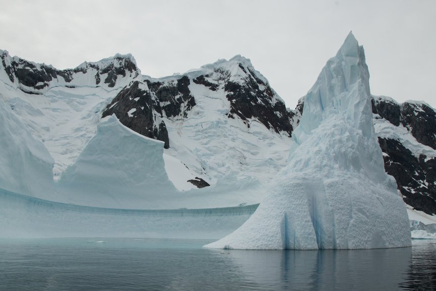 Booth Island is often referred to as a place where icebergs go to die. A frozen graveyard where drifting ice, burdened by its own weight, grinds to a halt in the shallow waters surrounding the island. Once at rest, the icebergs are gradually eroded at their waterline by waves, leaving behind sapphire cantilevers that skirt towering wind-carved spires and knife-edge ridges. We explored this icy labyrinth by Zodiac and found crabeater seals hauled-out on the pack ice. Abundant scars on these seals provided testament to past encounters with leopard seals, which were also scattered among the frozen platforms.  And of course, penguins, the dapper denizens of the Antarctic shores, could be seen nearly everywhere: in the water, high up on windswept nest colonies, and in transit along well-worn trails in between.