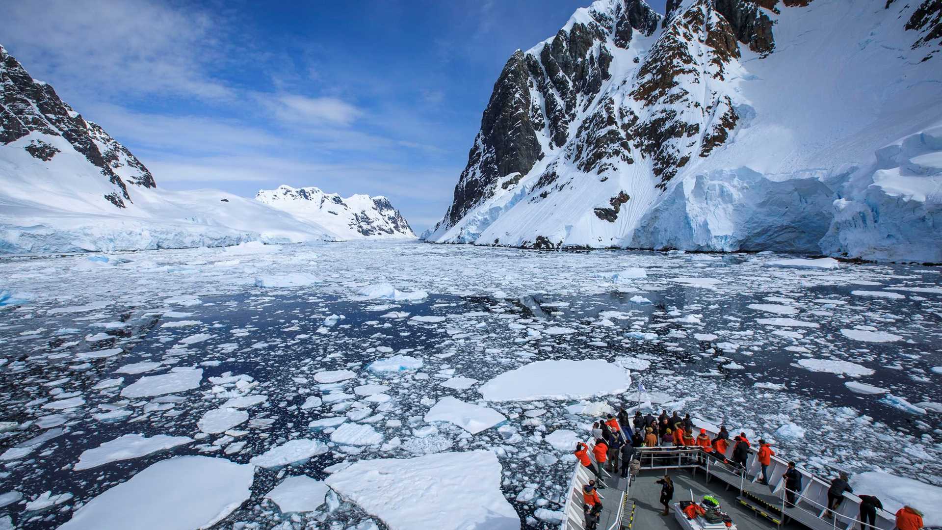 For nearly a week now, we explored the uninhabited expanse of the White Continent, including towering glaciers and abundant wildlife. There was virtually no sign of human life along the way, save for the scattered research station. Today, we continued our voyage into the Weddell Sea towards James Ross Island and Snow Hill Island to explore the human stories of the region and tales of early expeditions. Our morning began at James Ross, a relatively uncharted island. Ice crowds its shores, cutting off accessibility for much of the year. Hikes and Zodiac tours offered views of unique geology and of Snow Hill Island, our afternoon destination, across the way. There, we visited the historic hut from the 1902 Swedish expedition led by Otto Nordenskjöld. We learned about the team’s true saga of survival from historian Carol Knott. The afternoon’s polar plunge followed by a sunset cruise through a maze of tabular icebergs in Iceberg Alley topped off an amazing day. It was a perfect send off from the peninsula as we begin to make our way north toward the Shetland Islands and a final day of adventure.