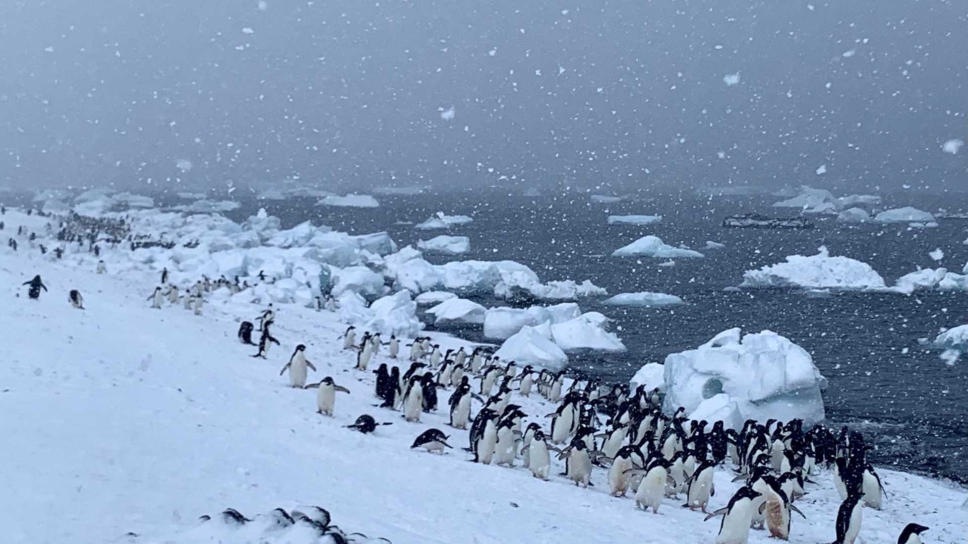 Lots of fluffy white stuff greeted us sideways, and the air temperature stayed below the freezing point. This was a “wrap up warmly” sort of landing. Large groups of porpoising penguins entertained everyone on Zodiac rides to the landing spot, where a winter wonderland greeted us. It is a spectacular sight to view thousands of Adelie penguins and a few gentoos line up by the hundreds to head out to forage in the sea. They looked a bit nervous as they passed, and rightly so. Leopard seals on penguin patrol waited along the water’s edge.