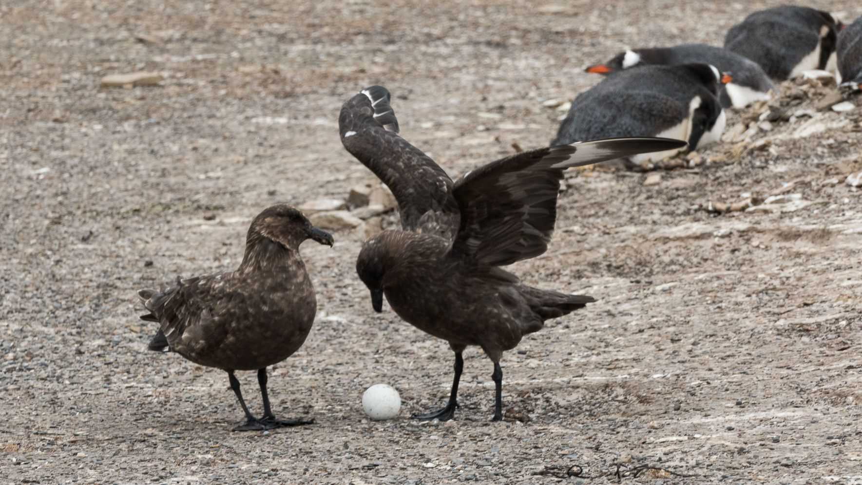 Above the penguin groups, the brown skuas circled hopefully, waiting to grab a momentarily uncovered incubating egg. A skua pair seized their moment and lifted an egg and dropped it on a spot just outside the group. They seemed to have some difficulty breaking into the egg and expressed agitation when a third skua swooped in to give the egg-cracking a try. Finally, the pair succeeded in getting to their meal.
