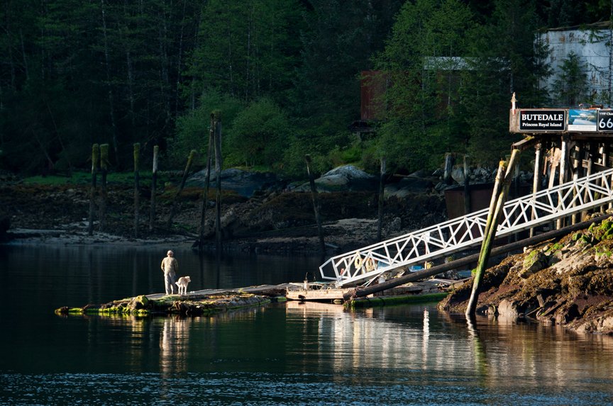 Calm, clear mornings are not an expectation on the Northwest Coast but they are certainly a welcomed sight. Hardly a cloud interrupted today’s transition from lush, temperate rainforest to sinuous, glacially carved ridgelines capped with dark blue sky. Tucked into the bottom of the frame, at the edge of a glassy sea, were the jumbled facades and crooked boardwalks of Butedale. Only a lone gentleman, his cat Tiger and dog Buddy, live amongst the remains of this old canning operation. The dilapidated array of tanks, old canning houses and moss cloaked pylons offer us one of the better looks at the bygone era of pre-refrigeration fish canning operations that once dominated this part of the world.