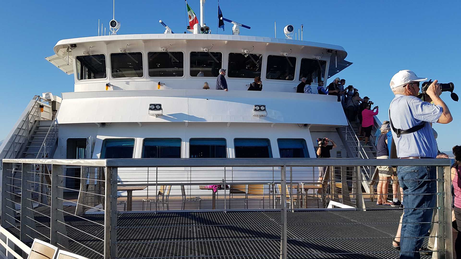 3:45 p.m.: Dear whales, I just wanted to say you’ve really turned this day around. The tail-lobbing, flipper-slapping, head-lunging, and everything-else-lunging is requiring me to use my entire quota of dashes for the day in just one sentence. Our fearless bridge team have taken us into the middle of what our expedition leader John Mitchell lovingly coined “humpback whale soup.” Several of us are contemplating surgery to have eyeballs placed on the backs of our heads just so we can keep tabs on everything that’s going on. Guess I’m going to need another camera. Let’s keep up the awesome work, Baja!