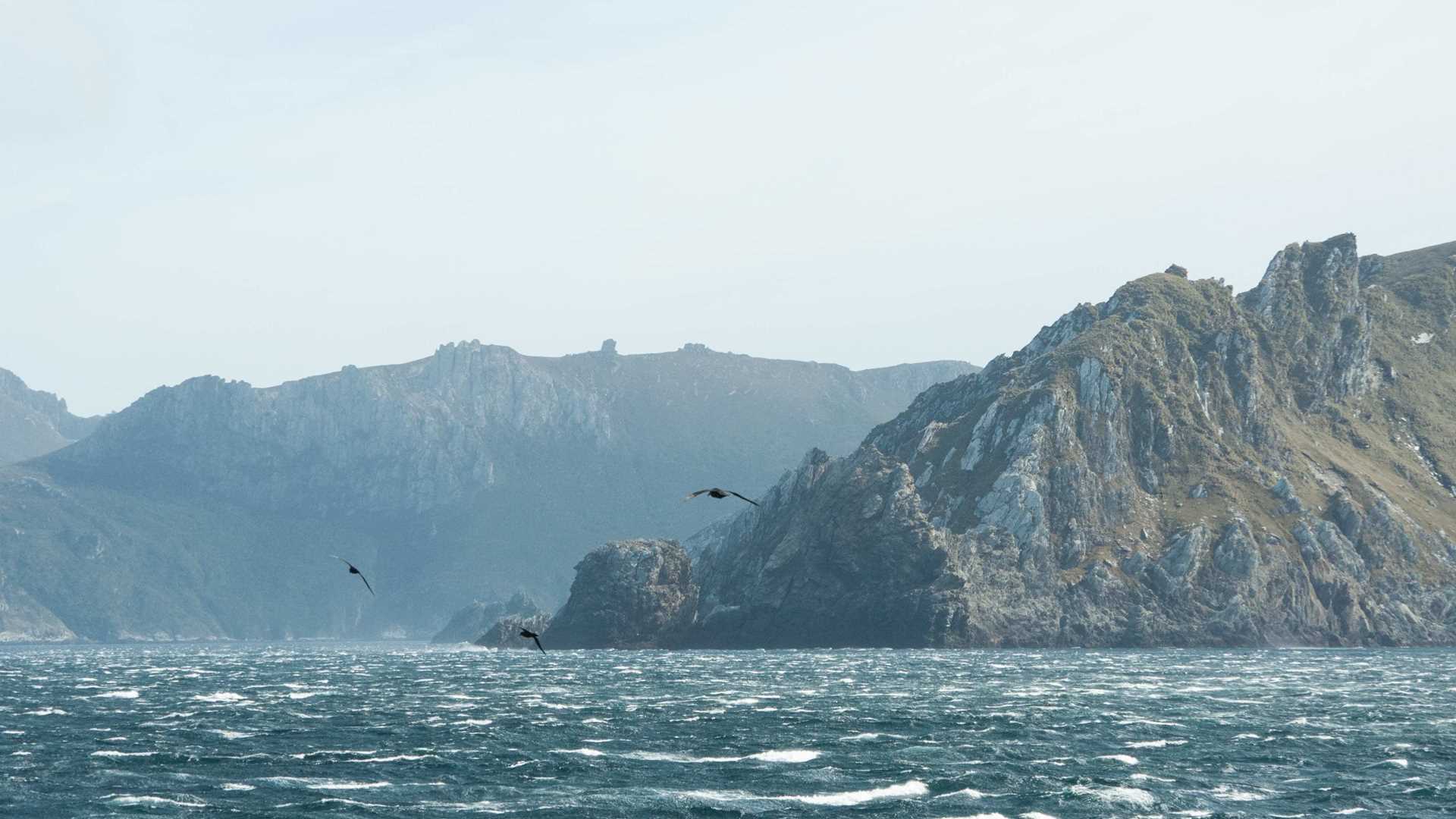 The sea conditions change dramatically once we head on a northerly coast along the east coastline, the wind and sea conditions become a lot stronger, the sea is seething and along the coast huge plumes of spray rise high into the air. Off in the distance breakers are spotted, the captain informs us that these are not caused by low lying reefs but are a rip tidal effect. We look in awe as we realize that all along this area hundreds of seabirds can be seen feeding on the nutrients that are being stirred up. As we sail through this area the waves become much larger, maybe 12 to 15 feet and some winds gusts head past the 50 knot mark.