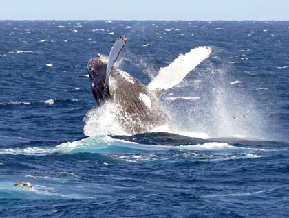 After lunch, we headed into a stiff northerly breeze searching for humpback whales and soon found a group of four males competing for a female’s favors—the group increased to six and finally nine! The whales traveled fast through the blue water, turning and throwing their flukes. Then abruptly the breaching competition began. One whale, sometimes two and once three whales, exploded out of the sea over and over again. We cheered them on, attempting to photograph each beautiful flying 45-ton animal twisting through the atmosphere. It was an incredible, stunning and exquisite display of strength and beauty. What unbelievable good luck we had there on the bow, witnessing for one magic hour a sight we shall never forget.