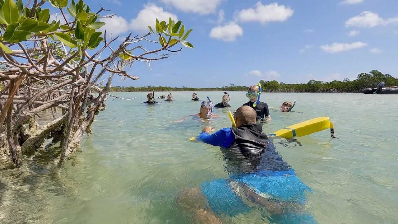 After breakfast, we landed on the western beach of Pigeon Cay, which has the softest white sand that flows out into beautiful, tranquil aquamarine waters. It’s as if the entire blue spectrum is represented from the beach when looking out into the water. Previous snorkeling days found us in the pocket reefs just off the shore. However, today we set out to explore the inland waterways and the mangrove environment by way of snorkeling. The mangrove snorkel showcases a vital marine habitat. We observed fish nurseries and the twisted root structure of the mangroves, which provide protection for fish, turtles, and birds. It also provides the area with valuable protection from storm surges and coastal erosion.