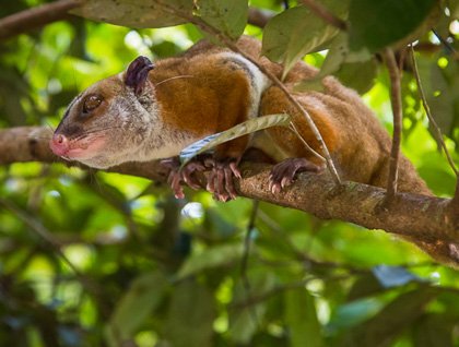 In the late afternoon we had some fun and rare sightings from our skiffs. We saw saddle-backed tamarins, scarlet macaws, a white-throated toucan, and an unusual sighting of a woolly mouse opossum. We were just about past it and the keen eyes of our skiff driver somehow picked out a small ball of brown fur hidden in a leafy bush. This opossum was easy to identify by a certain blue body part it had, to keep this rated G, no more will be said here.