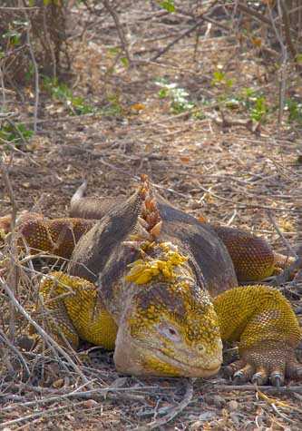 This morning we arrived to the north-western coast of Santa Cruz Island, and landed on a site known as Cerro Dragon. This place has a good number of Galapagos land iguanas, and we found several as we walked towards the hill. As we walked through the incense tree forest, we also observed some of Darwin finches, Galapagos mockingbirds, and as a surprise we found a small new born Galapagos land iguana, well camouflaged in a small bush.