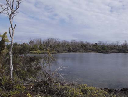 After an early morning weather update, and soon after breakfast, our explorers were at the disembarkation gate for today’s dry landing. Cerro Dragon, at the northwestern coast of Santa Cruz Island, was our destination this morning. All of our adventurers prepared for this expedition and were rewarded, for soon after we landed at a brackish water lagoon we viewed some flamingos feeding along the coast of a nearby pond. We were hoping to see a large number of birds, including sandpipers, whimbrels, and white-cheeked pintail ducks. We walked along the path, stopping to photograph birds along the way and to learn about the vegetation around us.