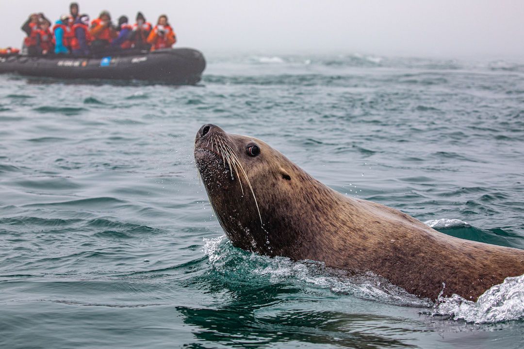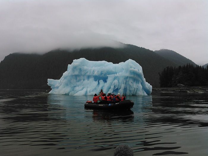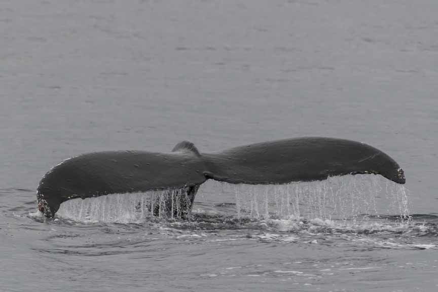 After two full days of exploring the northernmost area of our route, we turned south and cruised down Chatham Strait, in hopes of finding some whales. It was a beautiful morning and we were soon rewarded with our first views of these amazing leviathans. There were many single humpback whales feeding in Chatham Strait, along with several small groups, one that included a small calf! After enjoying these wonderful marine mammals for an hour or so, we continued southward, stopping at Kasnyku Falls, and then picking up our representative from the Alaska Whale Foundation at their headquarters in Warm Spring Bay. We continued our journey, finding more whales, and finally making an incredible after dinner stop in Red Bluff Bay, to view one last spectacular waterfall.