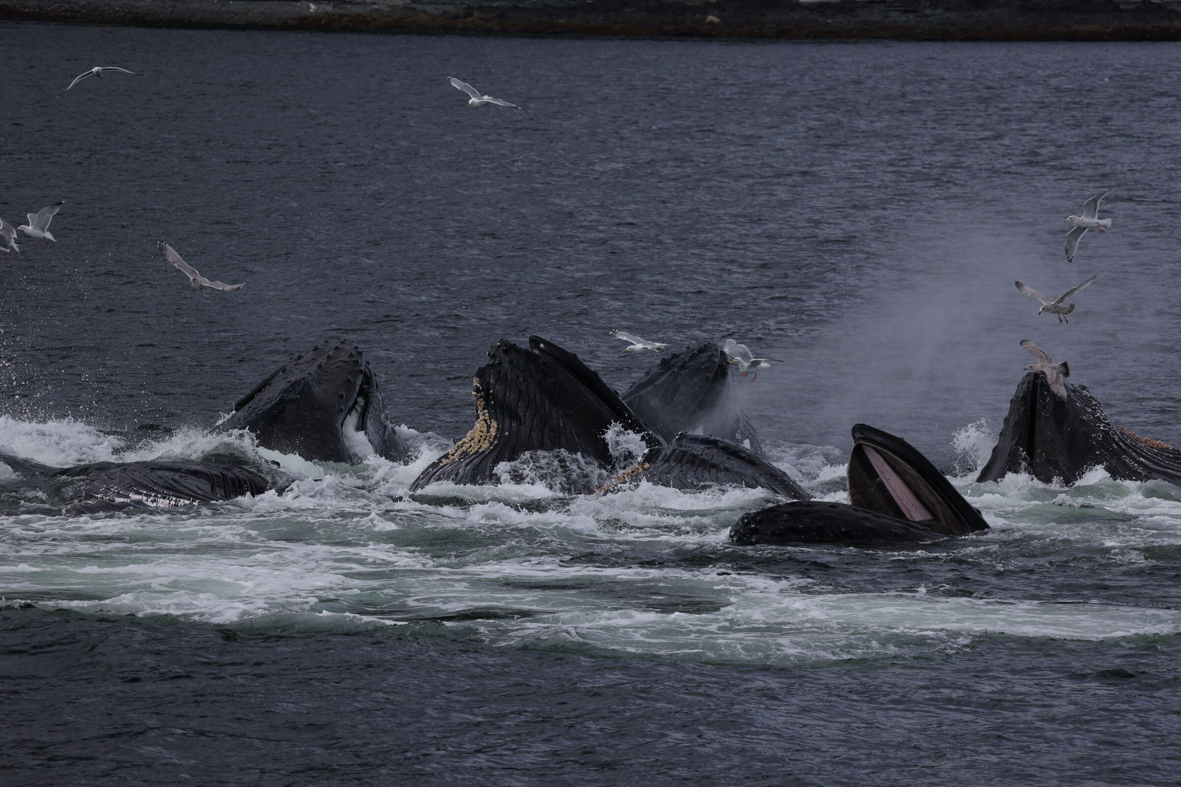 Those dining aboard had their lunch interrupted by those dining next to the ship: humpback whales engaged in cooperative bubble-net feeding were spotted off the bow. We approached slowly, and the whales returned the favor. They continued to inch their way toward our vessel until they were bubble-netting just a stone’s throw away. This was a total sensory experience: we heard the powerful exhalations, we saw the light scatter as a rainbow through the mist of the blow, and we smelled the salt waft through the air. Gulls spiraled above the pod, waiting for their own sensory cues to join in the feeding frenzy. The birds mesmerized us as they gyrated through the air and switched directions on a dime. Some guests waited with bated breath while others screamed with joy. All reactions, muted or audible, conveyed the awe only brought on by the natural world.