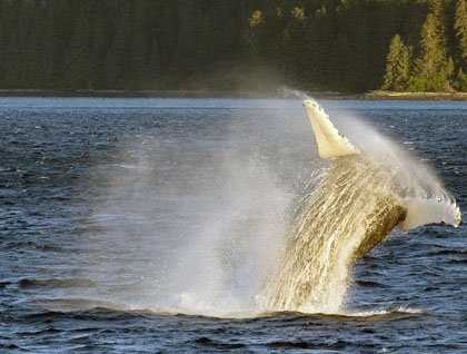 During the evening hours, the National Geographic Sea Lion made her way northwards and then west out through Frederick Sound and into Chatham Strait. Winds were predicted to be 20 to 25 knots. As the National Geographic Sea Lion entered Chatham Strait those winds hit hard as she made her way slowly towards our morning anchorage. At some point in the night, our expedition leader was on the bridge and plans were changed to find shelter. As daylight crested, the bow of the ship was headed into Peril Strait, as we made our way towards Saook Bay. Naturalists were on the bow with the sunrise when a breaching humpback whale was spotted! At 6:30am a ship wide call went out and very soon the bow of the Sea Lion was filled with anxious whale watchers. The whale continued to breach in the early morning magic light, providing a fabulous start to our day. Again and again we watched as this animal soared into the air displaying its long pectoral flippers, water falling away in the high winds. The ship was expertly maneuvered in wind and chop for wonderful views of breaching and finally tale lobbing as the whale began to slow down to just surfacing for long breaths of air. Long before breakfast, we were already enjoying sightings beyond belief!
