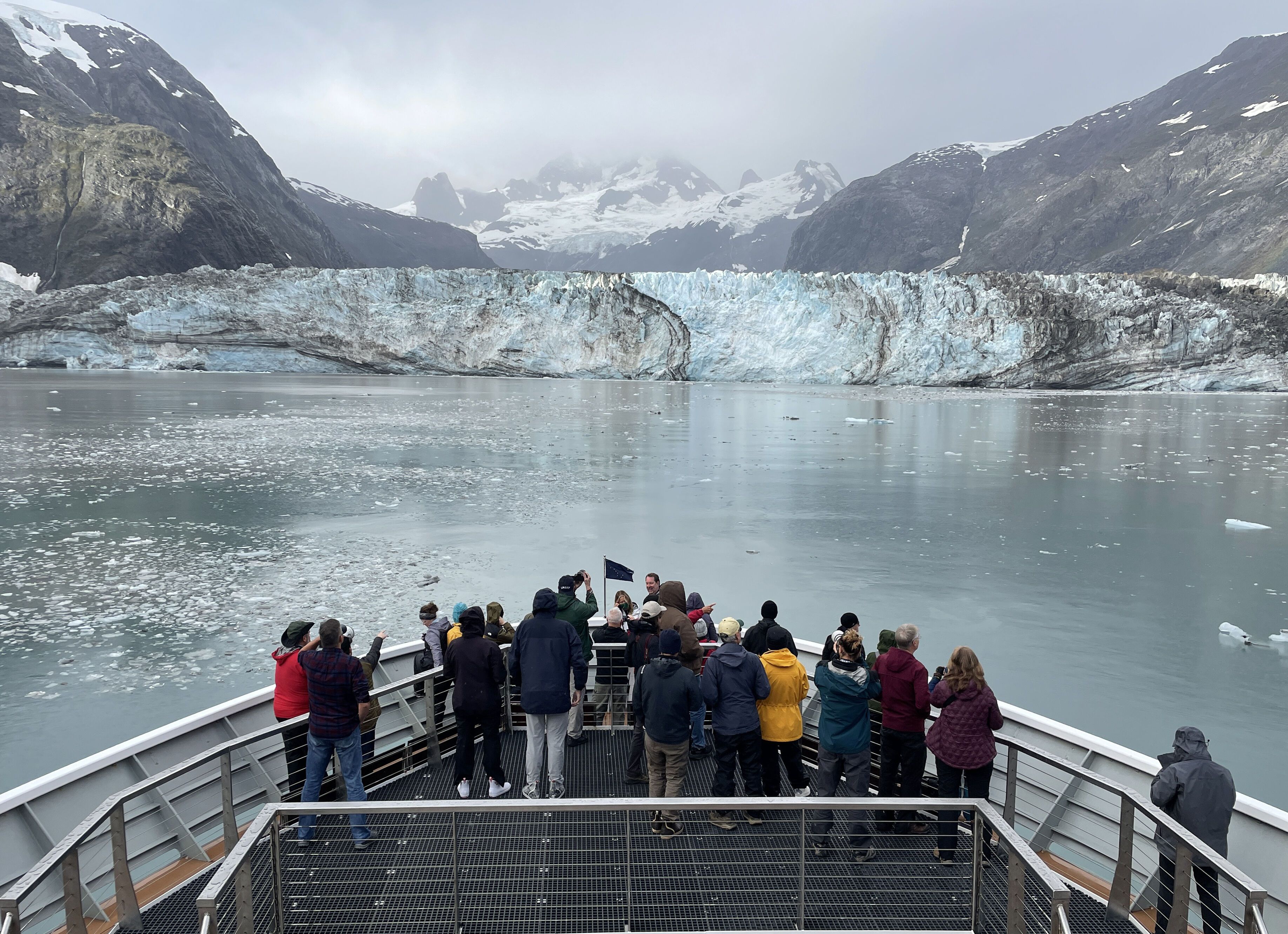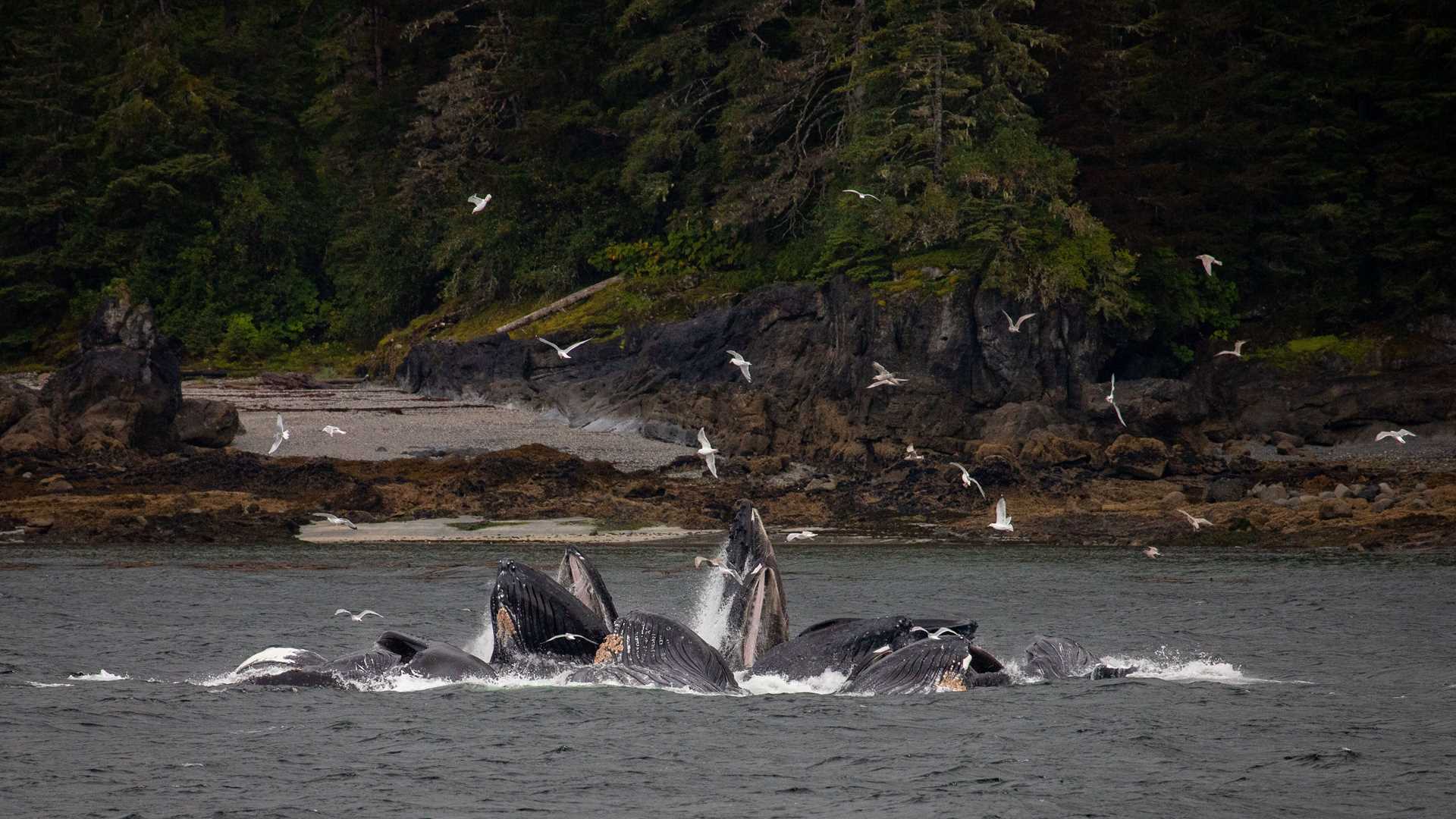 We awoke early today to scan for whales in Chatham Strait. We kept our eyes on the horizon, looking for the characteristic blows of humpback whales. We saw several individual whales before breakfast and then were treated to the incredible wonder of cooperative bubble-net feeding right after breakfast. This was soon followed by a double rainbow on the horizon. What a way to start the day! Throughout the morning and early afternoon, we cruised through the northern end of Chatham Strait and then west into Icy Strait, anchoring after lunch in a protected cove off the Inian Islands. This area is one of our favorites to explore by Zodiac. The waters are lively as the Pacific Ocean meets these islands in Cross Sound. Upwelling and mixing currents make for a great place to experience wildlife like Steller sea lions and sea otters, both of which we saw in great numbers today.