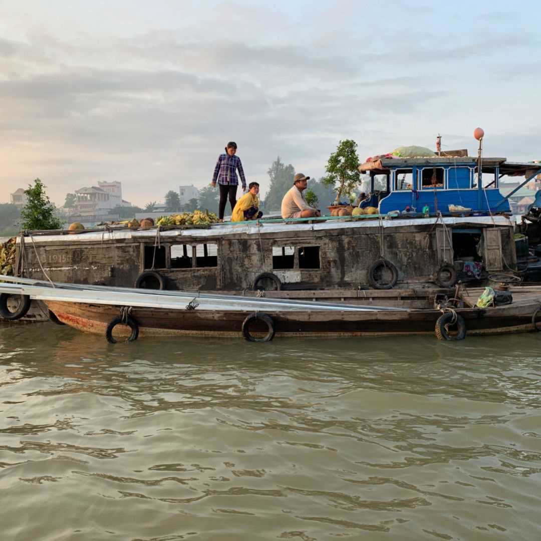 We began the morning at sunrise boarding longboats to visit merchants selling various vegetables and supplies in a floating market near Chau Doc. After cruising past the floating markets, we visited a family-run floating fish farm, where families build houses above large fish pens raising basa (Vietnamese catfish) and tilapia trapped in large cages below their house. After visiting the fish farms, we went into the Chau Doc market and rode on the famous trishaw, the Vietnamese version of a cyclo. The market was a maze of fresh meat, fish parts, colorful clothing, and fruits and vegetables. It was a busy morning and we will made it back to Jahan for breakfast.