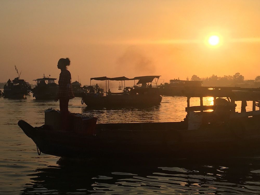 Fish and fruits come to market this morning as we started out in daybreak to experience the bustle of both water- and land-based trading markets. We had the opportunity to tour the colorful town of Chau Doc with yet another staple in local transportation, a front-bearing cycling carriage known as the cyclo. In the afternoon, we surveyed displays of local music and farming operations in the small village of My An Hung. Adventurous guests could taste unfamiliar fruits and climb across a bamboo “monkey bridge.”