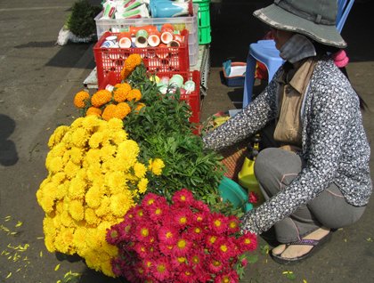 Out of the sampan and in, or rather on, the trishaw for a short tour of bustling Chau Doc is a fun way to get an impression of this city. Getting among the market stalls is a completely different sensory experience with the sounds of sellers repeating the price of their wares, the smell of fresh produce, and the sight of brightly coloured marigolds and chrysanthemums, some of the flowers required for Tet, the lunar New Year festival in a week’s time. Flower markets are extensive offering potted plants and the coveted apricot trees, leafless to force the flower buds to open in time.