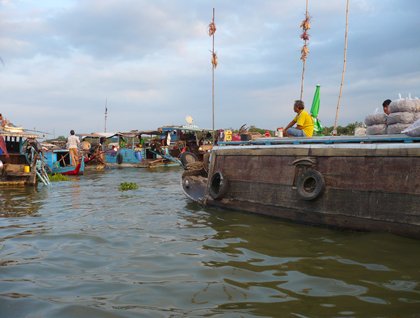 To escape the heat, we leave the Jahan bright and early at 6:30 a.m. We are split in two groups and board two covered water taxis to visit a floating market where numerous boats have come together to sell their products of fruits and vegetables. We see how the people with their children and dogs adjust to life on a boat. Later we are taken by our water taxis to see one of the hundreds of nearby floating fish farms, some holding up to 70,000 fish, which will go into a frenzy at feeding time. If they meet the standards, the fish will be processed, frozen and exported to the U.S., Canada, and Europe. These farm constitute a major investment: the producers must first procure fingerlings, then purchase the expensive nutritious feed pellets (sometimes as much as $200-400 per day), and pay the overhead for their floating farms. If the fish price is good at harvest time, then the payoff can support a family very comfortably.