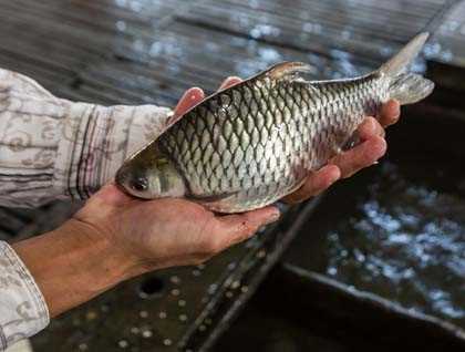 Perhaps the highlight of the morning was a visit to the Nguyen family fish farm, located in mesh pens right below their wooden floors of their floating farm! Ingeniously the fish are purchased as fingerlings, then fed a combination of commercial fish food as well as food scraps processed right here at the farm. Hand fed twice a day, as many as 100,000 fish will be brought to market in just under a year. Primarily the fish are tilapia and catfish. The average price for these fish is about $2 USD per kilo, and at harvesting time most of the fish will weigh just about a kilo each. If they meet standards, the fish will be processed, frozen, and exported to the U.S., Canada, and Europe. If the fish price is good at harvest time, then the payoff can support a family very comfortably for a year.