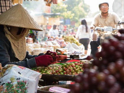 After transferring to the local boats, we make our way through the floating market, in which dozens of vessels laden with fresh fruit and vegetables have gathered in the main channel just outside of town to trade. Effectively a small floating village which assembles each day, we see the vendors in heavy freighters with rudimentary living quarters, smaller runabouts which ferry the produce to shore, along with even smaller soup kitchens selling breakfast. Next we head over for a closer look at a floating fish farm, having passed many already along the river. Greeted with the overpowering odour of the fish food, we learn about the day-to-day workings of the local industry.
