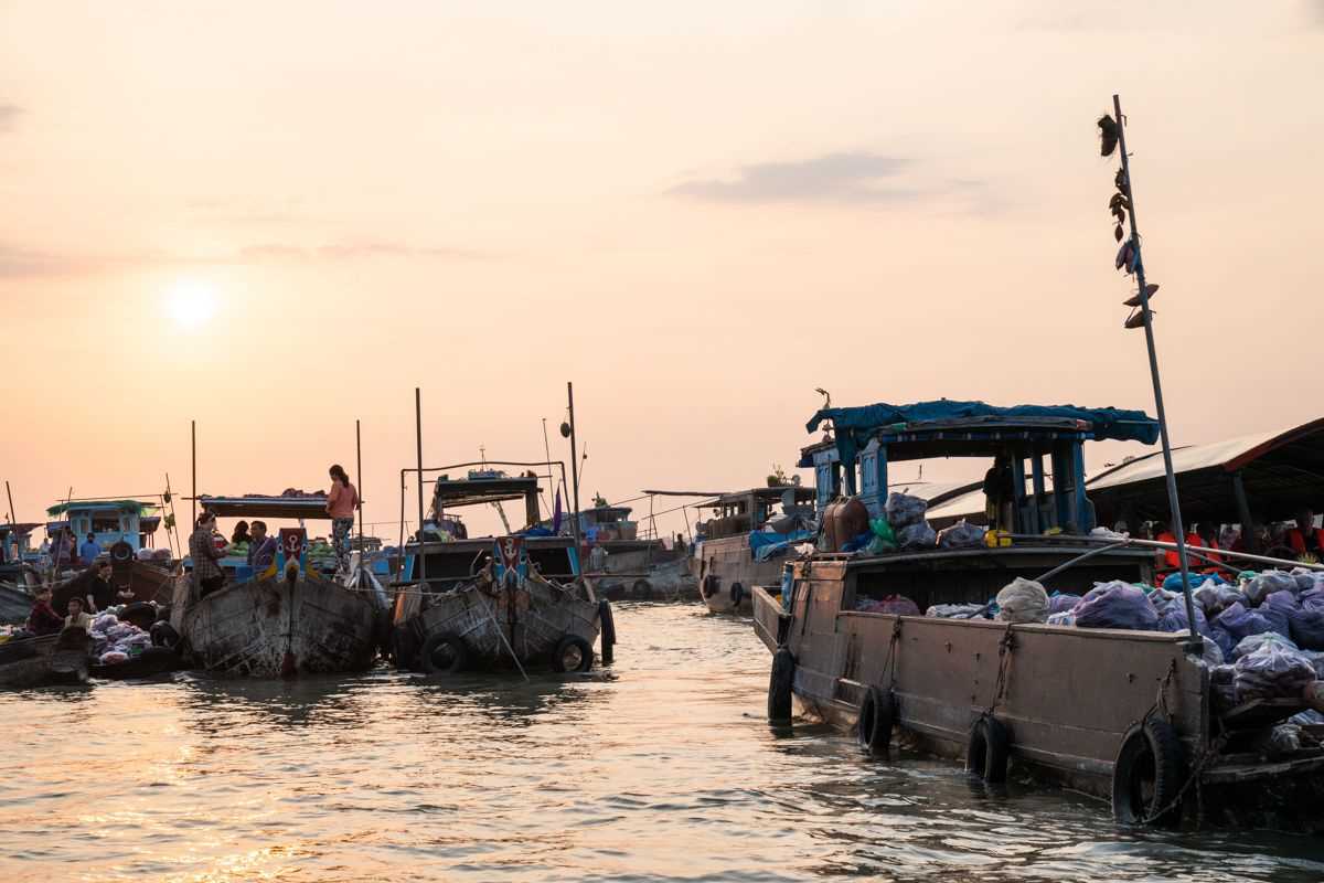 By sunrise, most guests were in ready anticipation for our morning excursion to the Vietnamese city of Châu Đốc. The convenience of using smaller vessel allowed us to anchor in close proximity to the city’s floating market, where after we boarded local boats and headed swiftly into the bustle of the early morning market. Positioned on the Bassac River, the Chợ Nổi Châu Đốc contains dozens of merchant vessels, each filled to the brim with local fruits and vegetables. Merchants will stay there for days while locals and travelers alike happen from vessel to vessel to buy and sell goods. Our guides maneuvered our own small fleet between much larger boats, bringing us within several feet of the action.