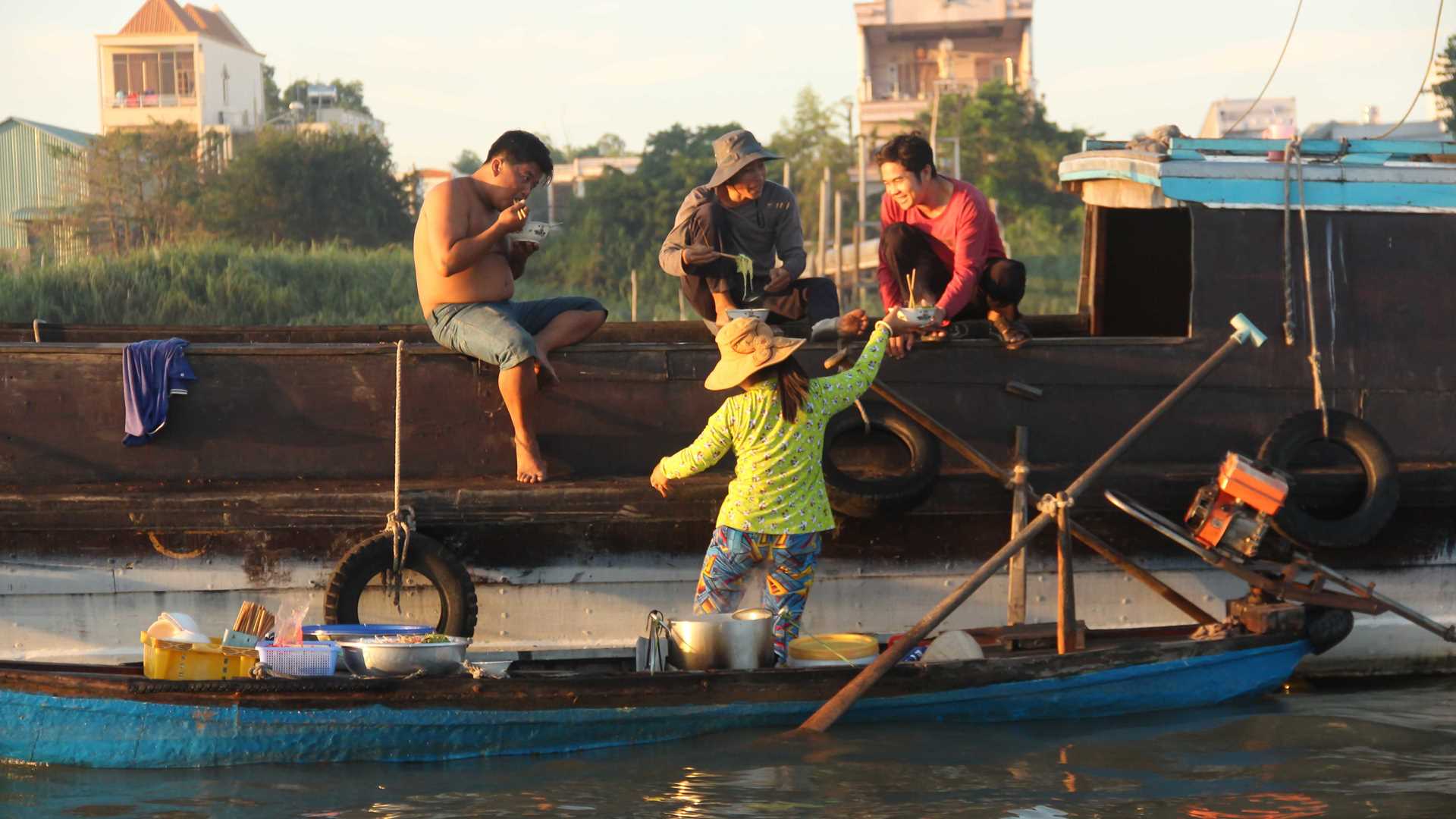 Good morning, Vietnam! Our first day in the Mekong Delta saw us climbing aboard local boats and cruising through a floating wholesale produce market. Bulk transports bearing fruit and vegetables fresh from the farm drop anchor in the middle of the channel where they unload their cargo to distributors in smaller vessels, who then take the produce to local markets ashore. Along the way to Châu Đốc, we stop at a floating fish farm. Tens of thousands of Vietnamese make their living this way, in which large cages are located underneath the waterline of their floating house.