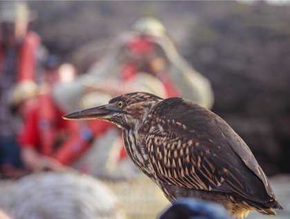 Before breakfast we started our day with a Zodiac ride along the Coast of Santiago Island. The coastline has a large black lava flow that occurred 117 years ago. During our Zodiac adventure we spotted striated herons, sea lions and Galapagos penguins fishing and basking on the lava fields. One of the striated herons was very friendly and landed on our Zodiac allowing us to take great photos.  After a while the same heron took a tour and landed on the second and third Zodiacs, too!  It provided an amazing morning show for our guests.