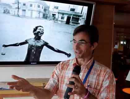 As we continue our journey down the coast of Brazil, we enjoy the opportunity of day at sea. The opportunity to be entertained by a maze of subjects, deep thoughts, and impressive talents in photography. Each one of our selected speakers continues to piece together the historical natural wonders of this journey along the east coast of South America. This morning we enjoyed Mark Curran’s presentation on religious belief and ceremony in Brazilian society. Then Tyron Turner, National Geographic photographer, presented a very powerful photography secession in black white film of the hardship reality of street kids of the Favelas of Brazil. The story through images that would soften even the hardest of hearts…as shown in the image of a street kid in a chemical-induced euphoria.