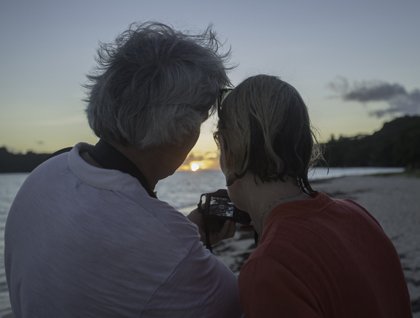 A few thoughts of this grand philosophical nature may have strayed briefly through our minds as we watched our first Seychelles sunrise, but before long it was time to turn our attention to more practical matters, like getting into the gorgeous crystal blue water as soon as possible. We picked up our snorkel gear, heard a few quick safety briefings, and before the morning was half over we were out in the Zodiacs on our way to the snorkel platform—our little portable private beach. This time the platform was anchored in the lee of Cocos Rocks, just a few little trees sprouting from big red boulders of…granite! And there was more granite below the surface, but these boulders had undergone a sea change—they were covered with lacy corals and attended by constellations of bright beautiful fish. We explored this wonderful underwater landscape until it was time for lunch, which we enjoyed in the outdoor café while National Geographic Orion moved around to an anchorage off the coast of Curieuse.