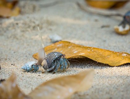 At first the beach seems normal, dotted with thousands of small dark stones. After a few minutes though, one realizes that most of the “stones” are moving. Throngs of hermit crabs have taken advantage of the piles of empty sea shells strewn above the high tide to find a mobile home. The crabs commandeer a small shell and make it their abode, carrying it around with them until they outgrow it, when they leave it and grab a larger one. What an efficient way for an animal to have the protection of a nice hard shell, without spending the time and energy to make one for itself.