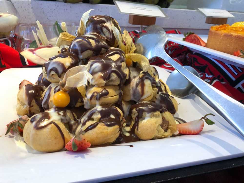 The first time today that I considered what the journey of these ancient explorers must have been like—the many adversities, the elements that battered them as they coursed out the same route we now follow—occurred while I was observing that afternoon’s dessert buffet, specifically at the pyramid of chocolate drizzled profiteroles.