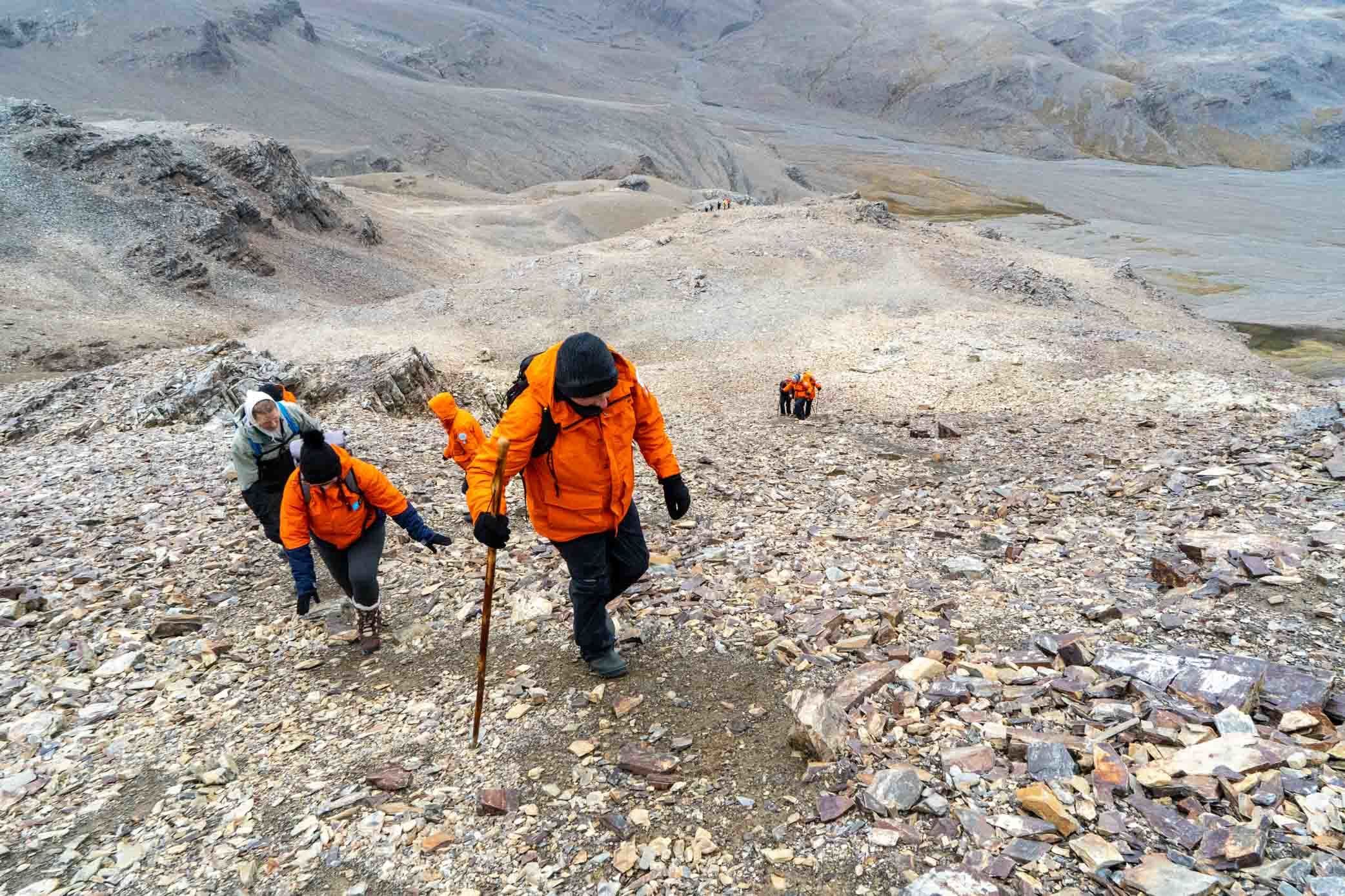In the early afternoon, the winds picked up as our bridge team navigated into Drygalski Fjord. The relatively narrow channel is a reminder of the power of the glacier that carved it in recent history. Sheer walls with distinctive layers lined the fjord on either side as icebergs and bergy bits gently floated beyond the ship. We got up close and personal views of Risting Glacier at the end of the fjord – a truly majestic landscape.