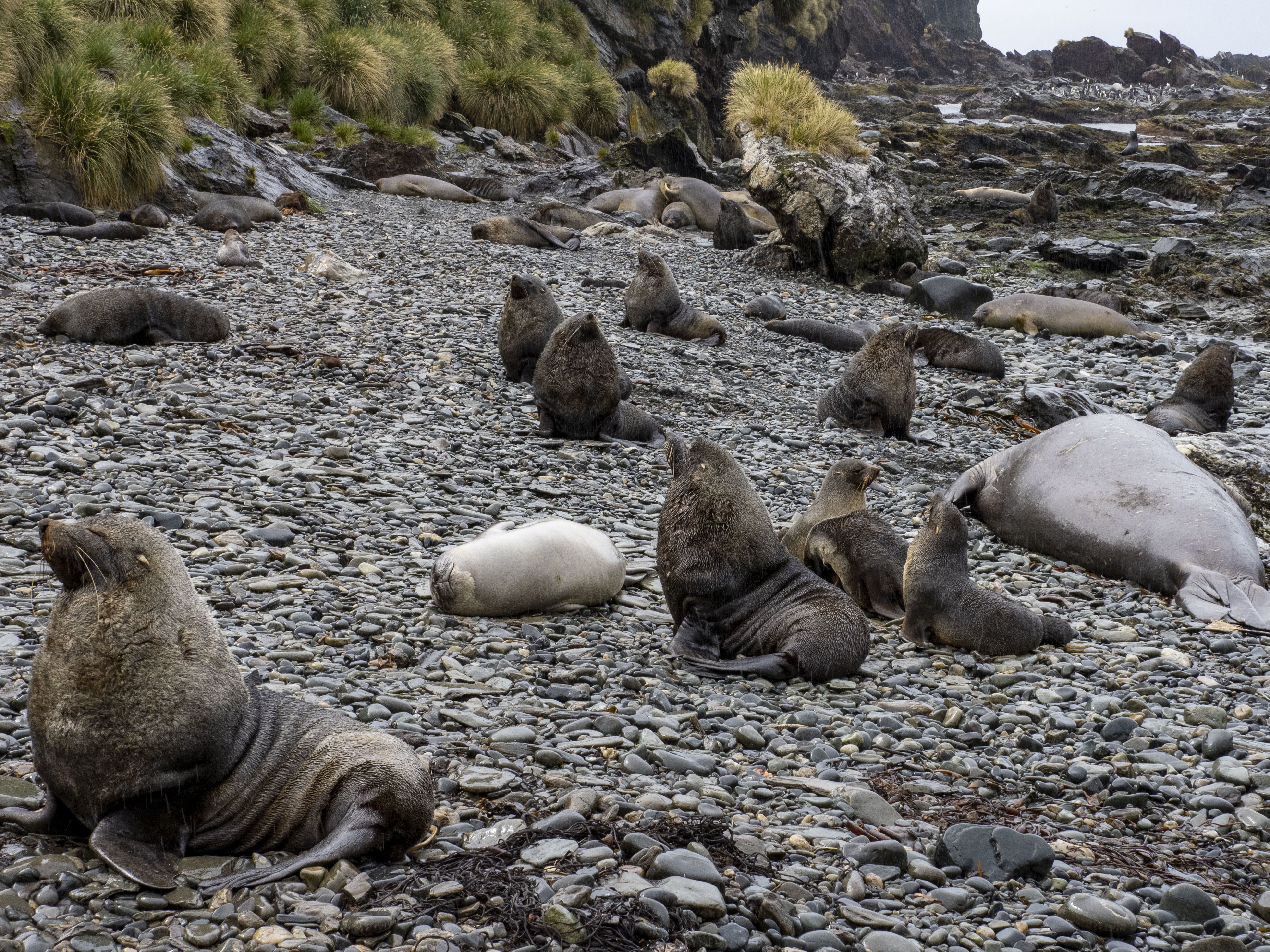 Speaking of tension, you can feel it rising as the Zodiac hits the shoreline and the first thing we see is a gauntlet of staff making a safe path for us between competing male fur seals. We discover South Georgia Island is going to make us earn our prize as we climb up a short but steep hill to the top of the ridge. There we make our way through the tussock grass, growing on tuffs of soil. Ever watchful for a resting fur seal, or a nesting penguin, we make our way to the main penguin colony.