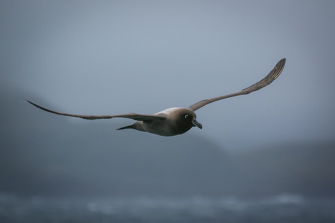 the sea into relatively small swells and cresting waves. A few albatrosses and