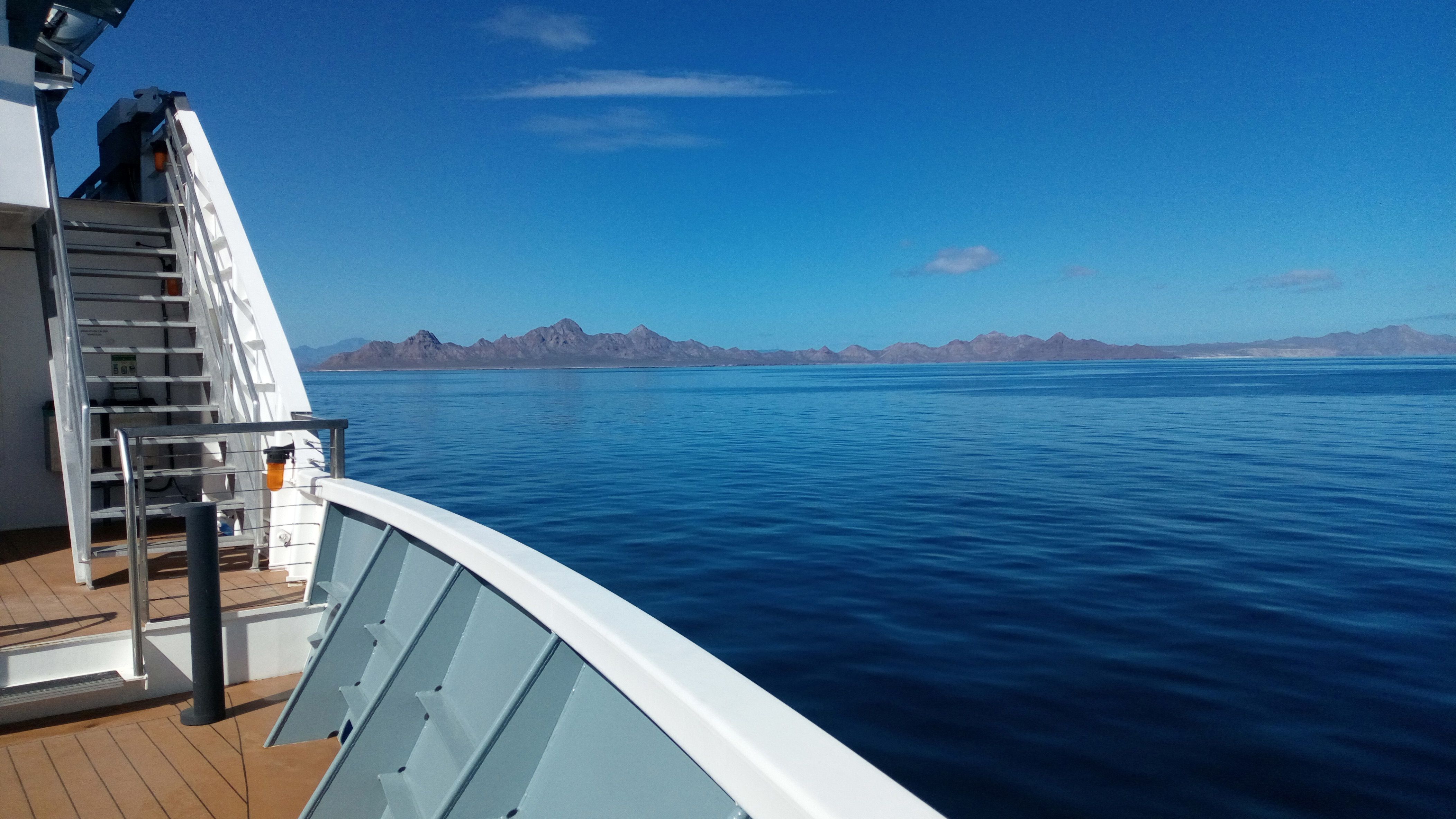 Today in our search for charismatic megafauna—the largest animals on the planet—we first encountered a large school of long-beaked common dolphins. They surrounded our ship, National Geographic Venture, and playfully rode our bow. Not long after, we encountered a group of bottlenose dolphins, who also played with the wave produced by the bow, delighting our spirits, eyes, and camera lenses.