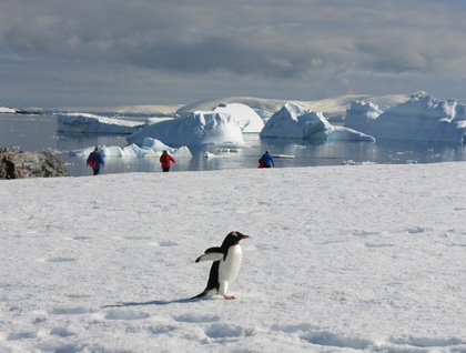 Beckoning us ashore at Cuverville Island were thousands of gentoo penguins. Irresistible chicks grabbed the focus of our cameras first. Radiant sunshine highlighted the shapes and shadows of the nearby icebergs and drew our attention from land to water. Those of us with an eye for adventure went for a slide down the slippery snow-packed hill. How fun it was to do something we had not done since childhood.