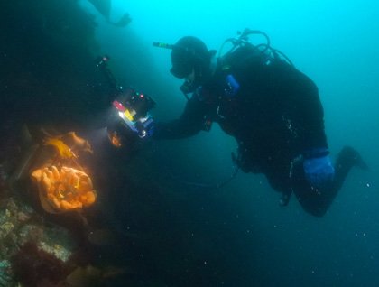 Finding shelter in the beautiful Errera Channel, we anchored off dome-shaped Cuverville Island. Home to the Antarctic Peninsula’s largest Gentoo penguin colony, guests wandered the rubble-strewn shore gawking and fawning over the Antarctic’s most entertaining resident. It seemed most fitting today, as its World Penguin Day. While guests were on shore, Undersea Specialist Erin and I went for a dive to another world. We found vertical rocks covered with pore-filled sponges and stinging anemones. Sponges were everywhere and in colors most think are relegated to effortless tropical dives. Orange, yellow, pink, and purple are rarely found topside in Antarctica, but if you’re willing to don 100 lbs of dive equipment, I’ll show you that it does exist below the monochromatic world above.