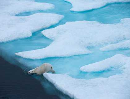 But wait!! Remember to never go to bed early in the Arctic! Seconds after typing a period at the end of the last paragraph we received a call for yet more polar bears. Noted over a mile off on the horizon numerous creamy dots could be seen entering and exiting the water on their olfactory journey to stock up on food. Eventually our path crossed one of these determined individuals who made a pit stop to see what we were. This young bear wearily crept up to the edge of a nearby floe, placing itself within whispering range of those on the bow. The only sound that could be heard was the slosh of water against the ship and the patter of shutters opening and closing. For five beautiful minutes this creature graced us with curiosity until caution got the better of it and it scurried off in search of food again.