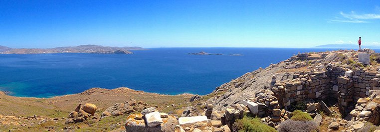 Delos is an isle of ghosts—uninhabited since the first century B.C. Once its population was 30,000 people. It all started in mythical times when Leto came here to give birth to her twins. First she bore Artemis and then Apollo. The sacred palm where this happened is a visible landmark. In historical times the people of Naxos, Samos, and Paros embellished the sanctuary with votives. The lions terrace, the colossal statue of Apollo, and the Oikos of the Naxians were the first. Later the Athenians purified the island and developed it further. The League of Ionian Cities of the Aegean met here and their treasury was kept in this sacred place. After the death of Alexander the Great the population grew. New trade routes developed and the religious center of the Cyclades became the commercial center as well. Under the Romans it was declared a free port and it became the center of the spice, grain, and slave trade of the Aegean. Mithridates, the king of Pontus massacred the population to show the Romans he would not be submissive to them. That was the end. For centuries no one lived here.